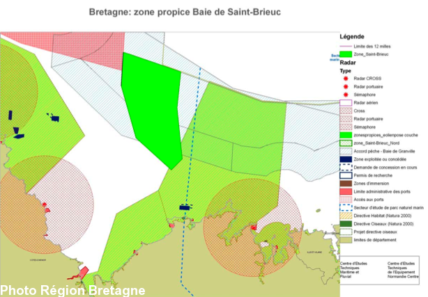 Le préfet de Région et le président du Conseil Régional ont présidé lundi 13 septembre 2010, avec le préfet maritime de l'Atlantique, une conférence régionale de la mer et du littoral consacrée en large partie à la planification des éoliennes posées en mer. Cette conférence a permis d'identifier, au large de la Bretagne, une large zone propice pour le développement de parcs éoliens off-shore, au nord de Saint-Brieuc (190 km²)