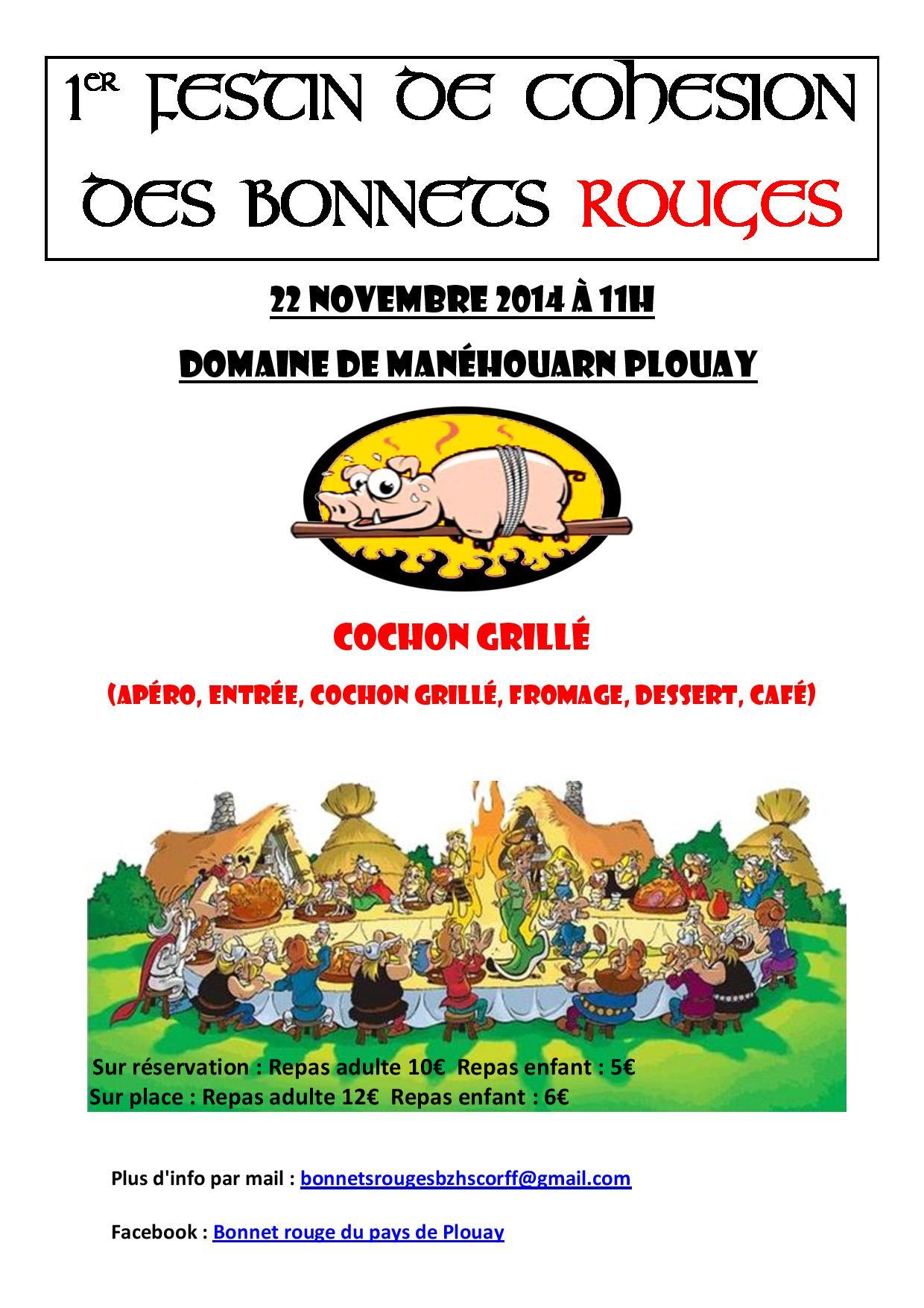 Le comité Bonnets rouges Scorff et Blavet organise un festin de cohésion, au Domaine de Manéhouarn, à Plouay, le 22/11/2014, à partir de 11 heures. lI est ouvert a tous les BR et à leur famille dans un esprit de cohésion et festif et nous vous proposons de nous retrouver devant un cochon grillé. Le tarif est de 10¤ pour les adulte et de 5¤ pour les enfants de moins de 12 ans en réservation et de 12 ¤ pour les adulte et 6¤ pour les enfants sur place. De nombreuses surprises seront de la partie et une ambiance festive durant tout le repas est prévue. Le cadre est agréable et, si le temps le permet, les enfants pourront s'éclater dans un parc fermé.