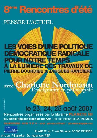 Comme chaque année la librairie Planète Io organise ses Rencontres d'été les 23-24-25 août 2007 avec Charlotte Nordmann. Il s'agira de débattre à la lumière des travaux de Pierre Bourdieu et Jacques Rancière des possibles voies d'une politique démocratique radicale pour notre temps.