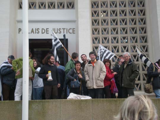 C'est entre 60 et 70 personnes qui sont venues hier soutenir les Inculpés de la Réunification au Tribunal de Saint-Nazaire. Thomas, Régis et Hubert tiennent à remercier toutes les personnes et les organisations qui les ont soutenus. En particulier Skoazell Vreizh qui depuis quarante ans soutient financièrement et juridiquement les résistants Bretons victimes de la répression. Ils remercient aussi leur avocat Maître Le Moigne, qui les a admirablement défendus et a fait preuve d'un véritable militantisme.