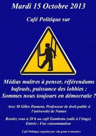 Le Mardi 15 Octobre 2013 à 20h au Café Gambetta de Vannes (56) se tient un Café Politique sur le thème : "Médias maîtres à penser, référendums bafoués, puissance des lobbies