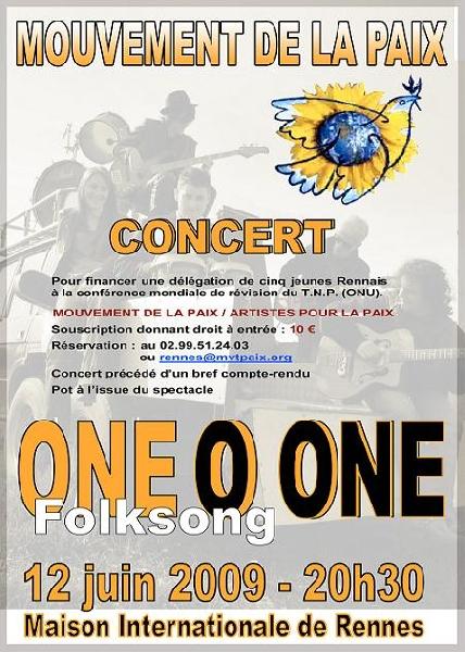 5 jeunes rennais ont participé pendant une semaine à l\'ONU à New-York à une conference préparatoire à la conférence e révision du Traité de Non proloferation de l\'arme nucleaire (TNP) fin mai 2009. C\'est dans ce cadre que le Mouvement de La Paix organise la soirée du Vendredi 12 juin , à la fois pour entendre un compte rendu du groupe et ensuite entendre le groupe \"One O One\" qui donne gracieusement ce concert dont les recettes seront exclusivement consacrées à convrir les frais de la délégation.