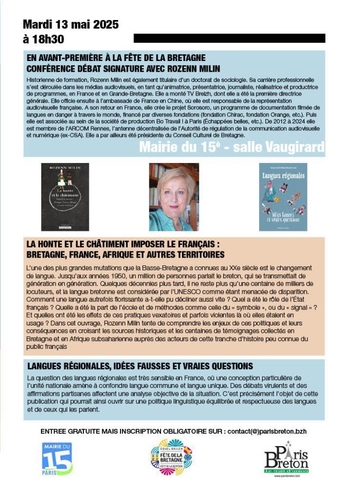Deux avant-premières en une, la conférence s'inscrit dans le cadre de la Fête de la Bretagne organisée par Paris Breton à la Mairie du XVe à Paris, et le dernier ouvrage de Rozenn sera disponible pour une signature. Rozenn développera ses analyses sur la situation des langues minoritaires dont le breton et il s'ensuivra un débat.