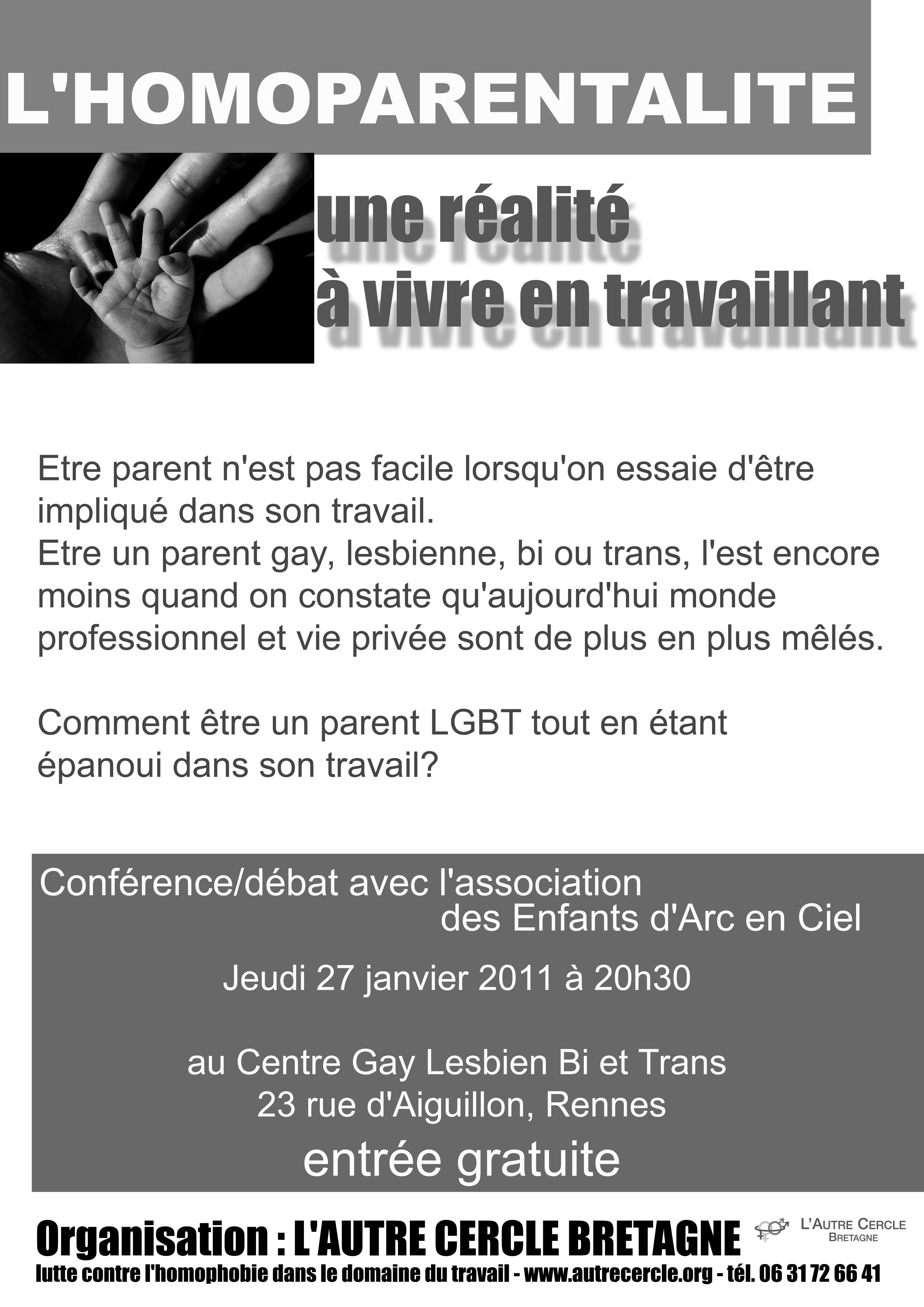 L'Autre Cercle – Bretagne et Les enfants d'Arc-en-ciel organisent avec le Centre Gay, Lesbien, Bi et Trans de Rennes, une soirée conférence destinée à tous les publics sur le thème « L'homoparentalité, une réalité à vivre en travaillant ».