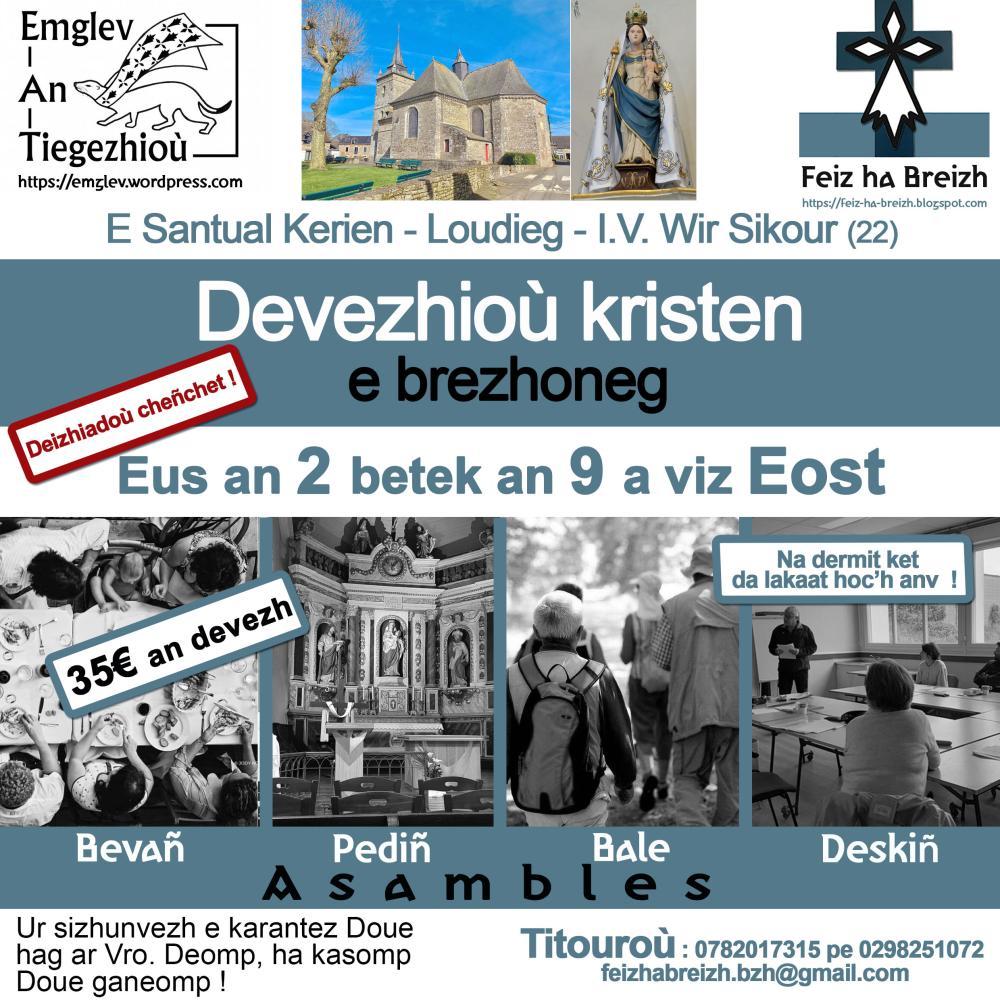 «Deomp, ha kasomp Doue ganeomp,ha lezomp an Diaoul da zrailhañ mein gant e zent !» ...Rimadelloù all a seurt-se ez eus e-leizh en hor yezh. Ur binvidigezh dispar ez eo, a rankomp deskiñ evit o zreuzkas d’hon tro, evel levenez ar feiz, ar garantez-vro hag hor yezh karet. Deuit d'an Devezhioù kristen !