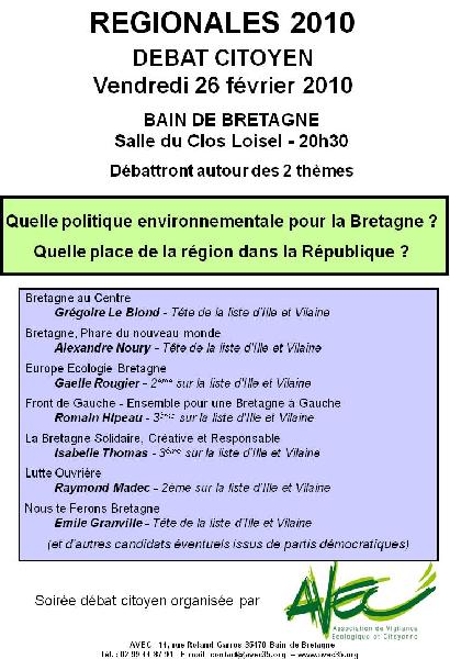 L'AVEC organise une soirée débat citoyen dans le cadre des élections régionales le vendredi 26 février à 20h30 à Bain de Bretagne (salle du Clos Loisel)