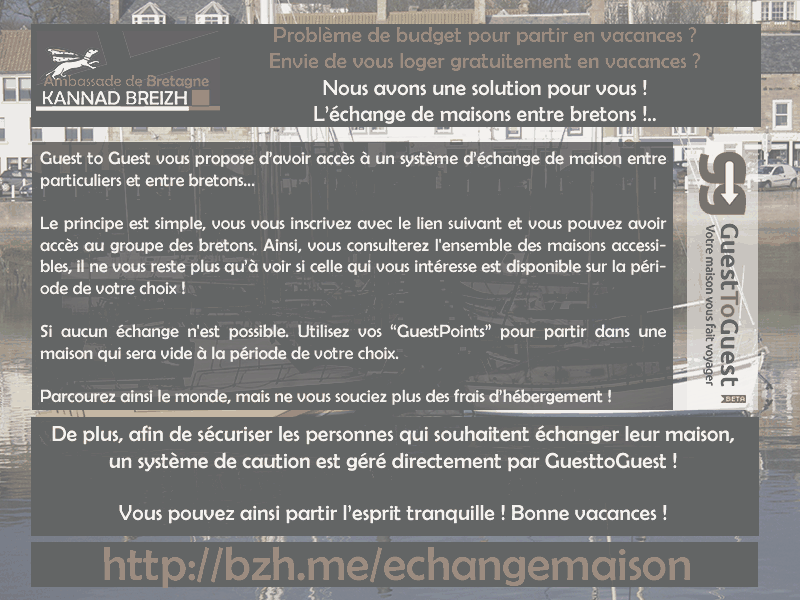 Guest to Guest vous propose d'avoir accès à un système d'échange de maison entre particuliers et entre Bretons...Le principe est simple, vous vous inscrivez avec le lien suivant et vous pouvez avoir accès au groupe des Bretons. Ainsi, vous consulterez l'ensemble des maisons accessibles, il ne vous reste plus qu'à voir si celle qui vous intéresse est disponible sur la période de votre choix !