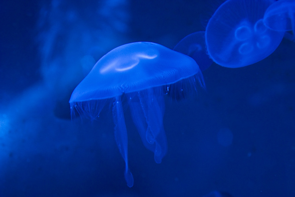 "Elles sont très spectaculaires, mais pas particulièrement dangereuses, car elles ne possèdent pas de tentacules urticantes pour paralyser leur proie", rassure Sébastien Cadiou, le responsable du pavillon tempéré d'Océanopolis, guère étonné d'observer les rhizostomes (rhysostoma pulmo) sur la côte atlantique. Cette espèce naît au large de la Charente, ce qui lui vaut le nom de méduse du Poitou.