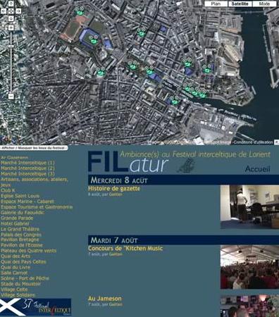 Le site se présente comme une grande carte de Lorient. Tous les lieux du festival y sont présentés et chacun a son programme. Au fil des jours, la carte s\'étoffe de lieux où nous avons filmé. Des iamges parfois drôles, parfois plus sérieuses... Rendez-vous donc sur filatur.net