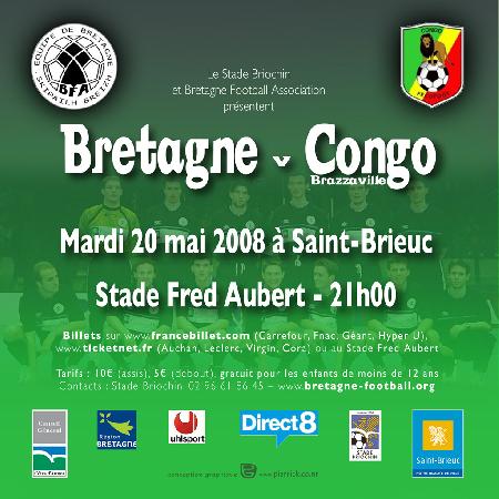 BFA a le plaisir de vous présenter l'affiche officielle du match de football Bretagne vs Congo, qui se déroulera à Saint-Brieuc le mardi 20 mai à 21 heures.