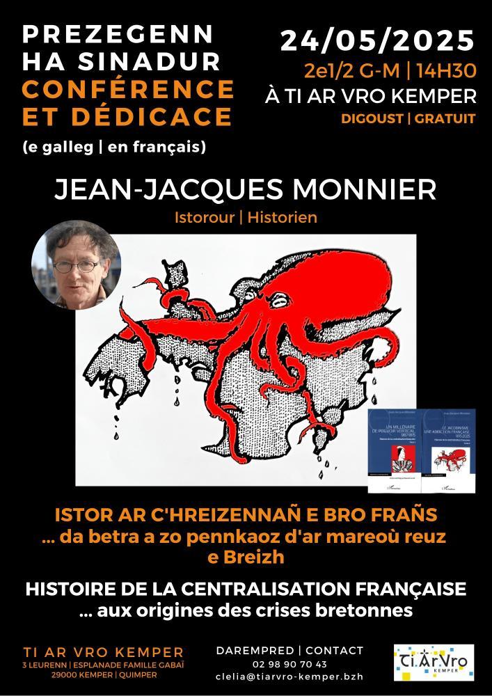 L'auteur vient de publier le résultat d'années de recherches et de documentation pour mettre en évidence la genèse, les caractéristiques et les effets du système centralisé français, qui s'est formé sous la monarchie, uniformisé sous la Révolution et l'Empire, et a perduré sous les différents régimes qui lui ont succédé. On a donc eu un millénaire de pouvoir de plus en plus vertical, et des populations qui ont perdu leur résilience au fur et à mesure qu'elles ont perdu leurs pouvoirs d'initiative et de gestion. La République a paradoxalement débouché sur la hiérarchisation et l'inégalité. Cette analyse conduit à examiner ce qui s'est passé en Bretagne mais aussi ailleurs. Le système singulier et autoritaire dans le fond s'est appliqué à l'hexagone avant d'en sortir et tous les efforts pour en sortir ont été vains parce qu'en un millénaire, une caste se forme qui a pour objectif non le développement et la démocratie mais la main-mise sur les esprits comme sur les territoires. En passant d'Alsace en Occitanie, de Montbéliard à Nice, de Bretagne au Pays basque et en Catalogne, mais aussi au coeur des territoires de culture française dominante, la machine à créer de l'inégalité et de la marginalité au nom de l'égalité a fonctionné et ses méfaits s'intensifient. C'est aussi un problème de citoyenneté niée et d'égalité bafouée dont résulte un mauvais pouvoir et des citoyens qui sombrent dans l'individualisme pessimiste qui conduit aux votes extrémistes et destructeurs. Une présentation multimédia permet de présenter cette évolution méconnue et d'esquisser un bilan. Le débat doit permettre, par la compréhension de cette évolution singulière, d'imaginer à partir des réalités des actions communes, parfois bien au-delà de la Bretagne, pour sortir d'une situation et d'un système dont on est tous les victimes potentielles. Les deux livres présentés seront disponibles, qu'il s'agisse de "1000 ans de pouvoir vertical" ou de "Le Jacobinisme: une addiction française" publiés par l'Harmattan au début 2025. Deux livres qui invitent au débat prospectif. Ti ar Vro, Esplanade famille Gabaï, Kemper, samedi 24 mai à 14h30. Durée : 2 heures, débats compris. Gratuit