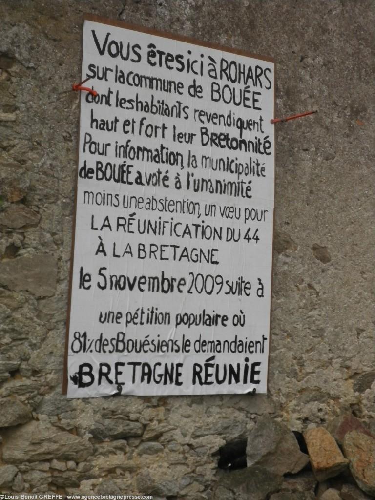 Des membres de l'association Bretagne Réunie demeurant à Bouée ont réalisé une affiche et pavoisé d'une dizaine de Gwenn ha Du la route qui menait de Bouée à la chapelle. « Pour bien faire remarquer qu'ici c'est la Bretagne » explique à Agence Bretagne Presse Hervé – chargé des voeux de réunification au CA de Bretagne Réunie. « Nous avons la chance qu'un membre de Bretagne Réunie habite au bord de la Loire à Rohars même. Le pignon de sa maison était donc une place de roi pour notre affiche » poursuit Hervé. Affiche qui n'a pas manqué d'être vue par les invités à la cérémonie, puisqu'elle se trouvait juste au bord de l'unique route qui mène de Rohars à Bouée et en face du chemin venant de la chapelle. Un Gwen ha Du se trouvait aussi planté sur un mât au bout de l'enclos de la chapelle, et malgré la brise de mer assez forte qui s'acharnait ce jour-là sur Rohars, l'étendard breton était encore là quand la Loire est venue au pied de la chapelle, qui, sur son affleurement rocheux, la défie depuis près de 682 ans.Notes 1 : Le discours de Claude Rousseaux est proche de sa préface du livre (voir PDF) 2 : http://cdfbouee.com/environs/steanne/travaux/janv2005/index.htm des Amis de la chapelle racontant en texte et en images l'histoire de la chapelle et de sa restauration. Nombreuses photos. Il est conseillé de commencer par cliquer sur celles de 2005 : http://cdfbouee.com/environs/steanne/travaux/janv2005/index.htm et de suivre les années 3 : http://fondation-patrimoine.fondation-total.org/fiches-projets/projet-135 de la Fondation Patrimoine