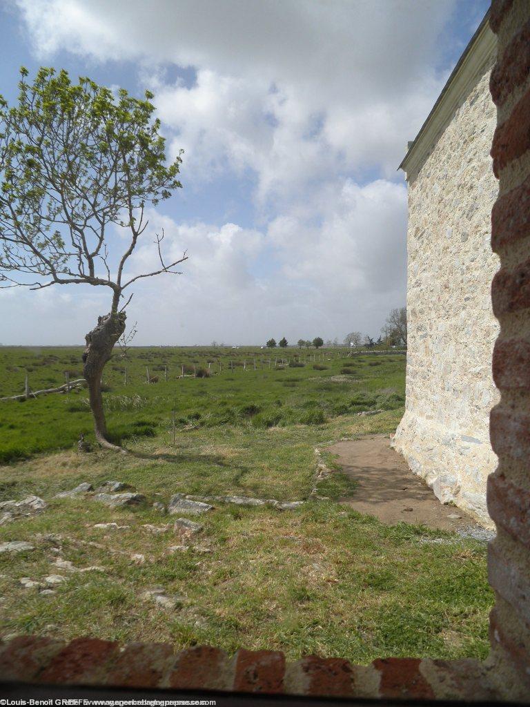 - Vue vers l’estuaire de la Loire. La chapelle s\'appuie sur des murs plus épais à sa base. Devant elle se trouve un kilomètre de marais pleins d\'eau. <b>Cliquer pour la voir entière.</b> Les autres photos extérieures sont sur ABP23637 (lien dans le texte).