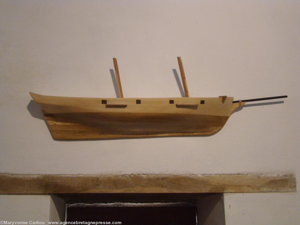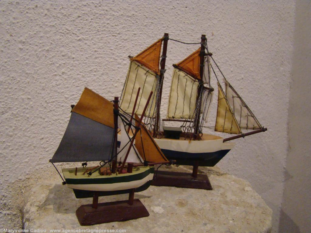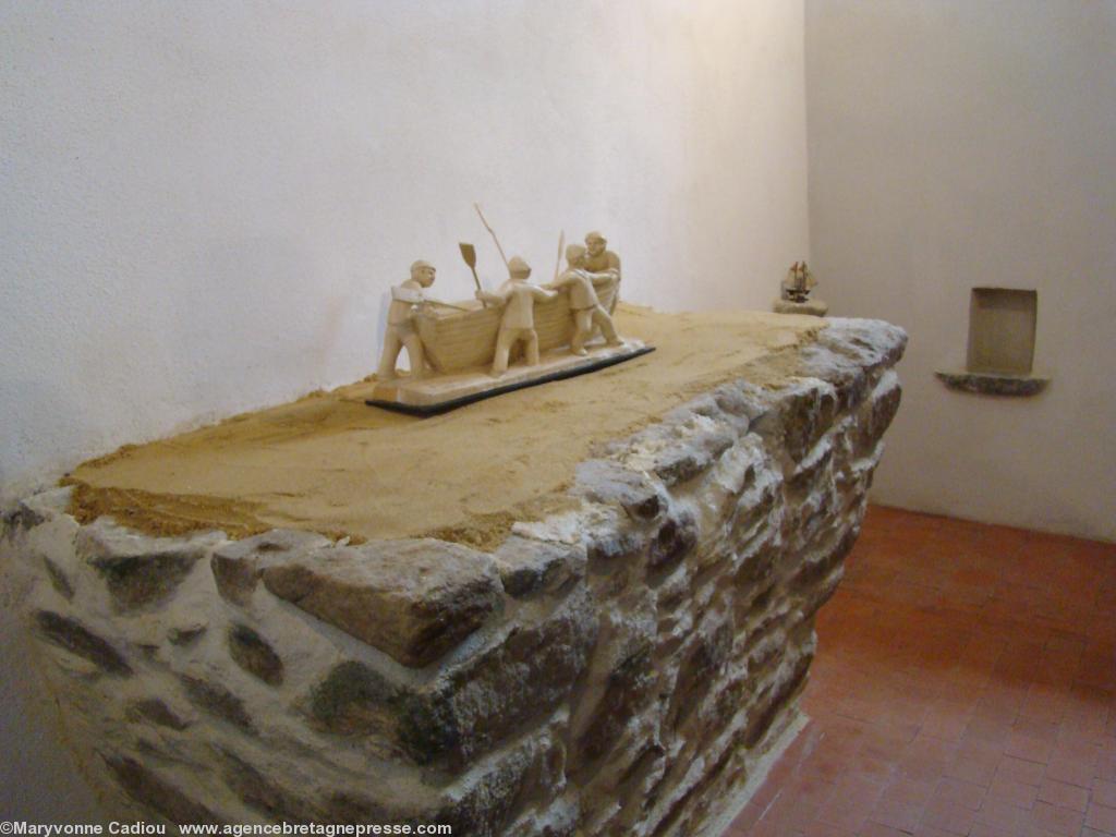 - Chapelle Sainte Anne de Rohars. À droite de l’“autel” gros plan sur de petites maquettes de bateaux de pêche.