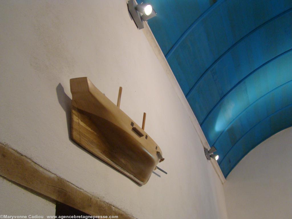 - Chapelle Sainte Anne de Rohars. La demi-coque de Régis Moreau et le plafond bleu en lambris.