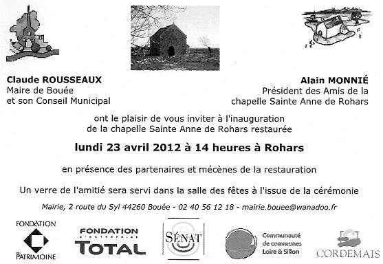 Le maire de Bouée, Claude Rousseaux (1), et le président de l'association des Amis de la chapelle Sainte Anne (2), Alain Monnié, ont invité pour l'inauguration de la chapelle Sainte-Anne de Rohars, sur la commune de Bouée, des personnalités – élus et représentants des mécènes qui ont permis la restauration : – deux sénateurs de Loire-Atlantique : Monique Papon (de 2001 à 2011) et André Trillard ; – la députée de Savenay-Saint-Nazaire Marie-Odile Bouillé ; – le président de la communauté de communes Loire et Sillon [de Bretagne], Alain Chauveau, adjoint au maire de Savenay. Pour les mécènes, étaient présents : – le directeur général de la Fondation Patrimoine (3) François Neyraud ; – la déléguée générale à la Fondation Total Catherine Ferrant ; – le directeur de la Centrale de Cordemais Denis Florenty. Personne du Conseil général puisqu’après deux ans (2007 à 2009) d’échanges qui traînaient il a finalement refusé une participation financière. Mais la discrétion fut de mise.