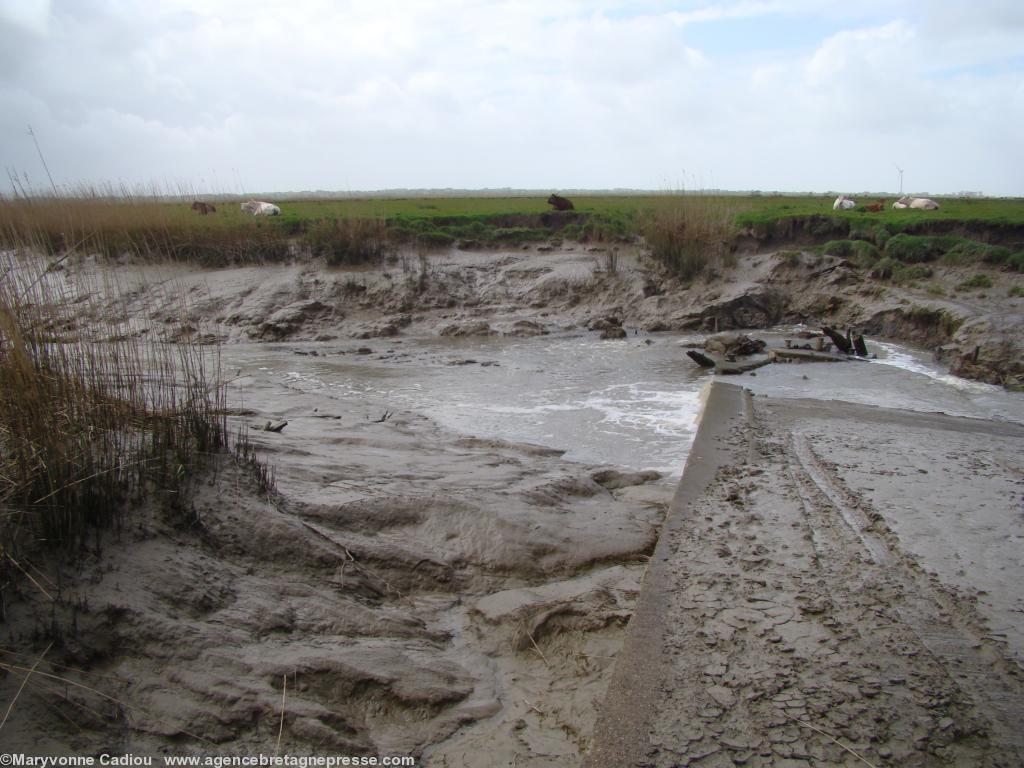 - Bouée. Le port de Rohars. Gros plan sur la digue et... la vase. L\'étier débouche sur la droite.