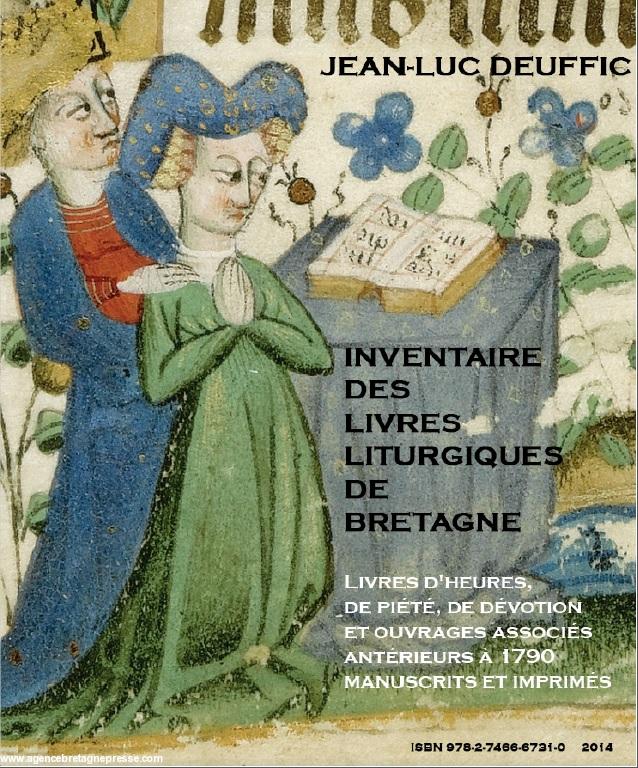 VIENT DE PARAITRE : Jean-Luc DEUFFIC Inventaire des livres liturgiques de Bretagne. Livres d’heures, de piété, de dévotion et ouvrages associés antérieurs à 1790. Manuscrits et imprimés. Mai 2014. ISBN 978-2-7466-6731-0. CDROM. Fichiers pdf.