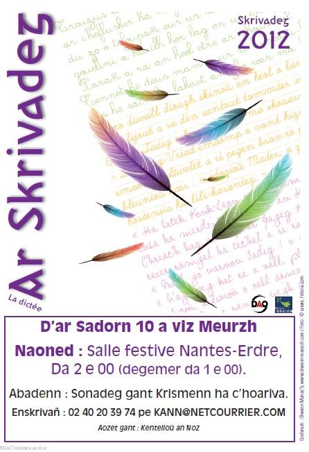 Cette année la Skrivadeg aura lieu le 10 mars à la salle festive Nantes Erdre, ainsi que dans plusieurs autres villes (2). Le public sera accueilli dès 13 h. A 14 h commencera la lecture du texte en breton. A la fin de la dictée, une pièce de théâtre présentée par la troupe d'enfants Electrake ainsi qu'un concert de Krismenn permettront aux participants de patienter le temps de la correction. Les meilleures copies seront sélectionnées pour la finale, qui aura lieu le 26 mai à Carhaix.