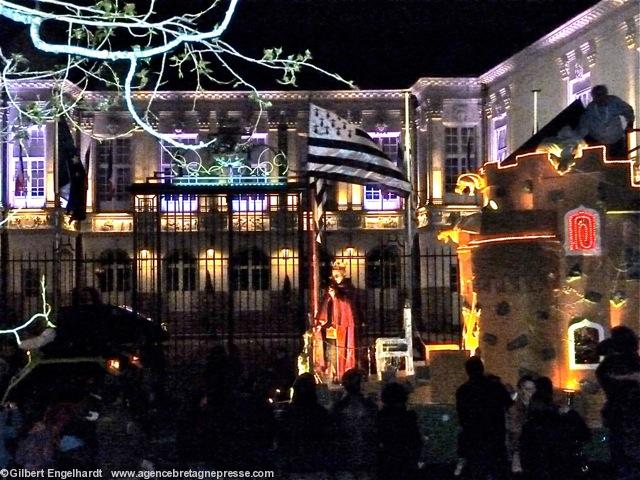 Le Carnaval se poursuivant en soirée hier, comme le veut la tradition, on a pu assister à une tentative de prise de la mairie de Nantes par le public. Sur une sono à fond les amplis, la musique du Bagad de Lann Bihoué – en écho aux Gwenn ha Du du char du Roi – accompagnait le carnaval de Nantes, et cela, c'était bien réel, ce n'était pas un conte ou légende, thème du Carnaval 2012 !