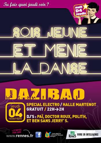 Pour le début de sa 7e saison, la soirée alternative du jeudi revient au centre ville de Rennes à la Halle Martenot. Le 4 novembre de 22 h à 2 h, menez la danse pour un Dazibao spécial électro entièrement gratuit