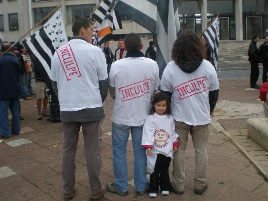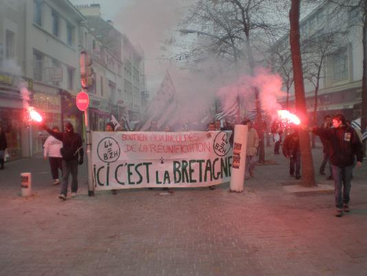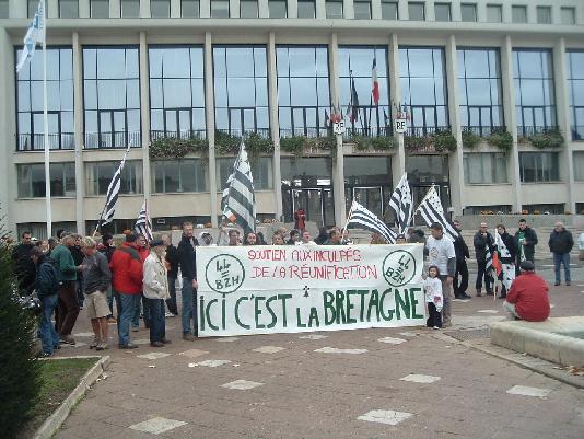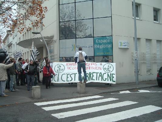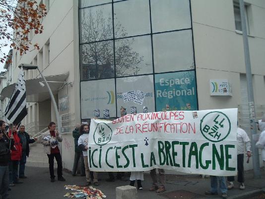 Le comité de soutien aux Inculpés de la Réunification tient à remercier toutes les personnes qui se sont déplacées pour la manifestation du 10 novembre à Saint-Nazaire. Entre 100 et 150 personnes ont pu voir une équipe de « Barbouilleurs Volontaires » repeindre et coller des affiches sur la devanture de l'annexe régional des PdL située rue F. Arago. La manifestation a ensuite pris la direction du Tribunal de Saint-Nazaire où des représentants des organisations Skoazell-Vreizh, Bretagne Réunie, Emgann-MGI, Parti Breton et du comité de soutien aux inculpés de la Réunification ont pris la parole et un texte de soutien d'Alan Stivell a été lu. Après un passage dans les rues commerçantes du « Paquebot », nous avons rejoint la mairie en criant les slogans « Pays de la Loire, pays Bidon, Loire-Atlantique, Pays Breton », « Réunification ! Non à la Répression ! », et « Batteux, Batteux, Ici c'est la Bretagne ». En effet le départ de la manif devant la Mairie était un lieu symbolique, le maire de Saint-Nazaire étant sans doute le seul maire de l'Univers à avoir été jusqu'à déployer deux drapeaux PdL ! (un ancien et un nouveau) au fronton de sa Mairie.