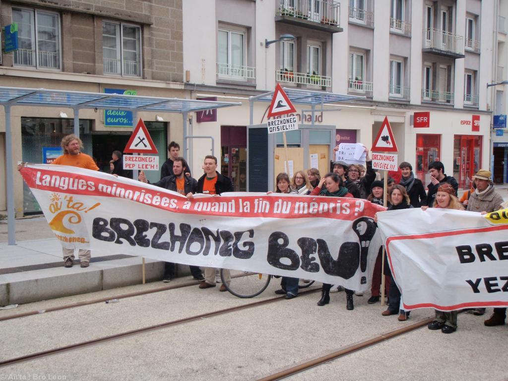Samedi après-midi, une trentaine de militants du collectif Ai'ta ! ont manifesté en centre ville de Brest. Pour exiger que la langue bretonne soit respectée dans le futur tramway et la stricte parité entre langue française et langue bretonne