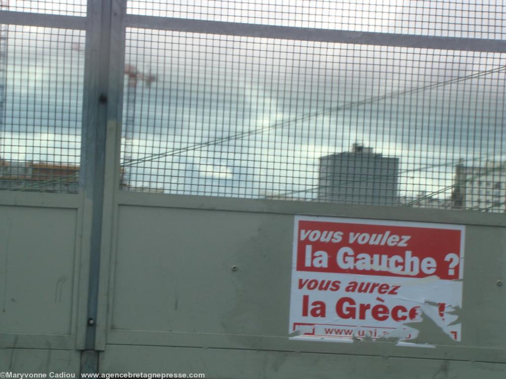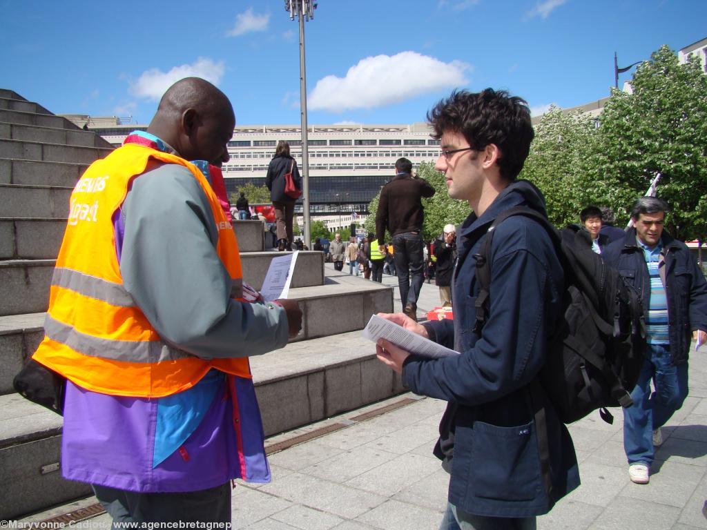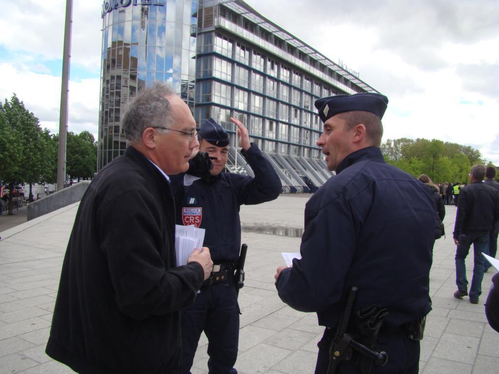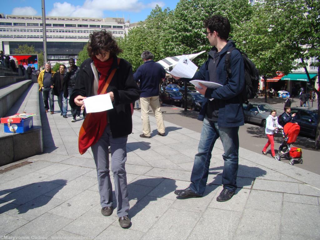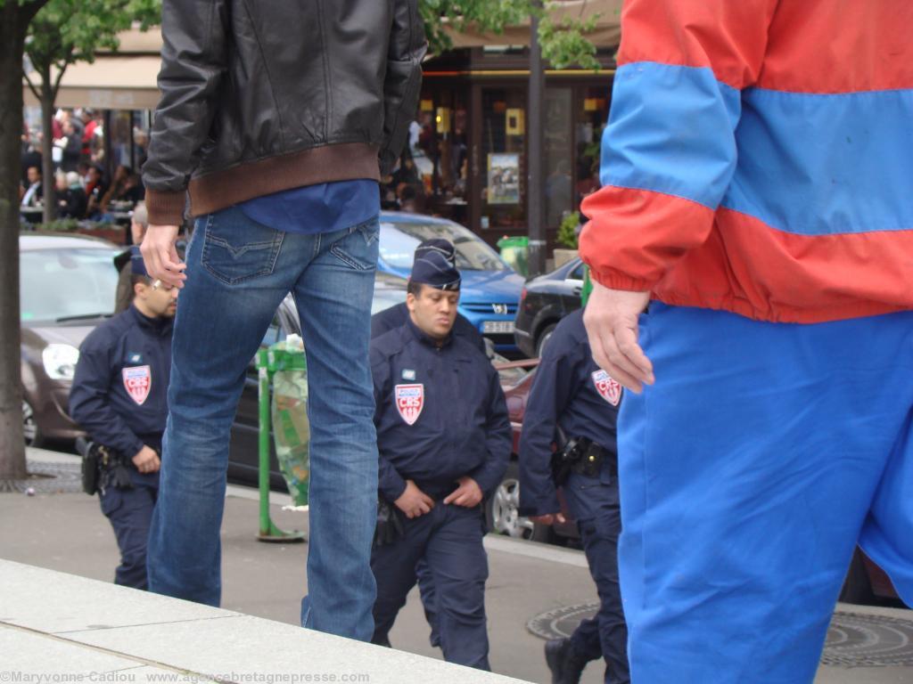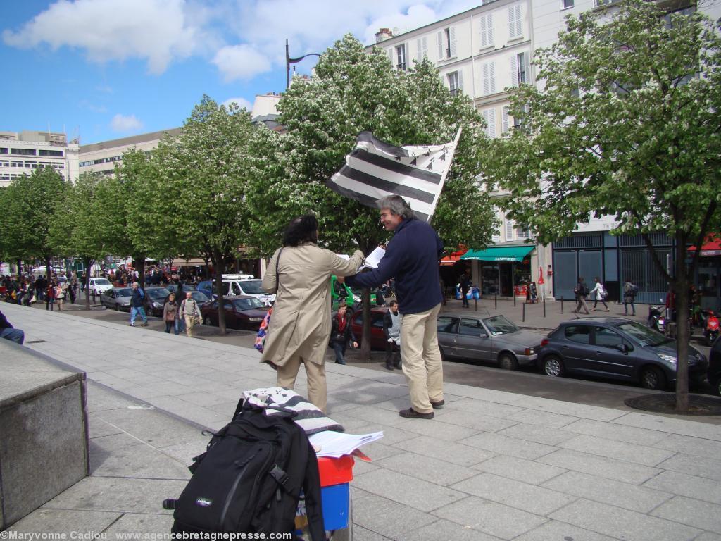 Gwenn ha du au vent entre les mains de Xavier, nous avons commencé à tracter, les uns aux gens dispersés qui rentraient à l'arrière du stade, les autres à ceux qui sortaient du métro, et à ceux qui se pressaient en masse devant les portes d'entrée principales. C'était rigolo d'essayer de fendre cette foule en mettant carrément notre tract entre les mains des gens et en leur disant " C'est pour la Bretagne et pour réunifier notre région divisée depuis Pétain, Pompidou et Mitterrand. Y en a marre de cette division qui nous est imposée depuis 70 ans ". Les bourgeois (socialistes) prenaient le papier avec un petit air de commisération avouant de temps en temps aimer la Bretagne car ils y ont une résidence (secondaire). Le " peuple de gauche ", moins méprisant, en revanche, soit hostile soit d'accord, mais réagissant, notamment les Français "récents". Les gens d'origine africaine étaient très intéressés par notre cause. Une des réflexions les plus drôles : " Mais qu'est-ce que vous faites ici ? Vous venez de Bretagne jusqu'ici distribuer vos tracts ? " Réponse : " Mais oui monsieur, les Bretons sont partout pour se battre contre cette situation inadmissible ". Les plus méprisants : les VIP prenant les tracts que je distribuais avec un mélange d'indifférence et de dégoût. Une Savoyarde est venue vers nous en nous félicitant : elle va nous envoyer l'adresse d'une association régionale de Savoie. Un mot sur nos deux compatriotes de l'UDB Paris qui ont tracté avec nous : pleins d'énergie, sympathiques et convaincus. Je vais les faire venir aux réunions de notre comité local de Paris. Pour terminer, une dernière touche d'humour : les deux CRS de passage à côté de Maryvonne. Non seulement ils ont pris notre tract mais ils sont accepté de se faire prendre en photo (et qu'elle soit publiée sans floutage) en nous souhaitant bonne chance. L'un des deux était franc-comtois, l'autre lorrain !