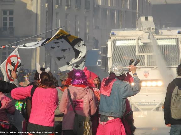 - 17h07. Lance à eau en action près de l'Hôtel Dieu. Voilà exactement le type d'action des forces de l'ordre, qui est difficilement interprétable, pour un observateur situé à seulement quelques dizaines de mètres. Prudence ou attentisme ou complicité? Voilà un terrain d'investigation tout désigné pour les journalistes spécialisés. Les militaires le font déjà, les policiers vont devoir apprendre à communiquer. Manifestation anti-aéroport à Nantes le 22 février 2014.