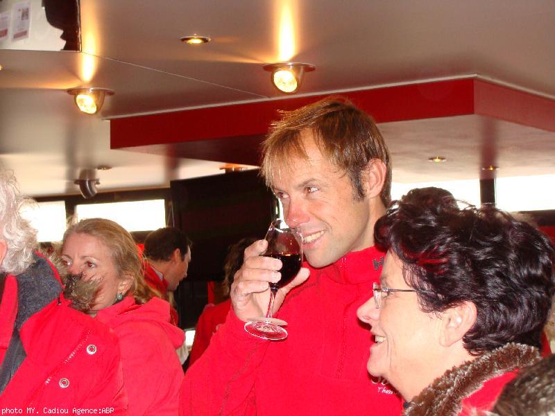 - Douché et rasé de près Thomas Coville rejoint les amis pour un cocktail de bienvenue. Premier verre de bon vin depuis... 2 mois.