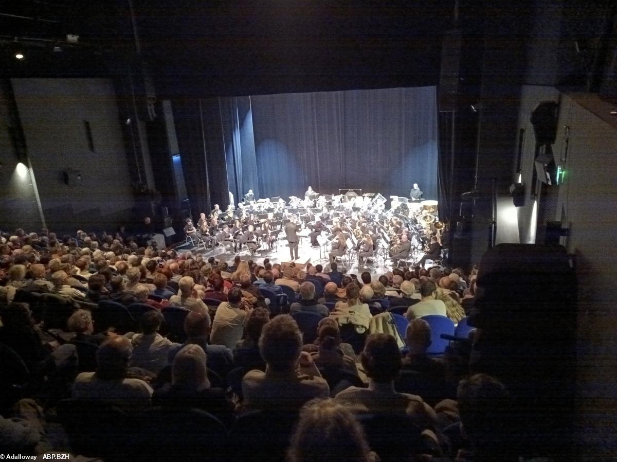 Nous voici installés tout au fond de la superbe salle de spectacle, toutes ouïes ouvertes, et c’est rien moins que l’orchestre d'harmonie de Saint-Brieuc et son hilarante percussionniste qui ouvrent cette cérémonie d’anniversaire bien peu cérémonieuse : gags en tous genres, musique douce et joyeuse, rutilante comme si jouée sur un paquebot en fête. Au programme : musique de films, musique de séries, medleys… Notre hôtesse nous fait deviner les titres sous formes de rébus (à gagner : un effeuillage du chef d’orchestre ! Rien que ça !) ou de devinettes avnat de regagner son poste aux percussions, derrière les flûtistes. Burlesque et tellement maîtrisé, cette première partie nous faisait craindre que l’orchestre d’harmonie de Pontivy, qui leur succédait, ne se trouvât en difficulté pour conserver un certain nniveau d'excellente. Cuivres et instruments à vent briochins, ainsi que leurs maîtres, nous avaient charmé. Point du tout !