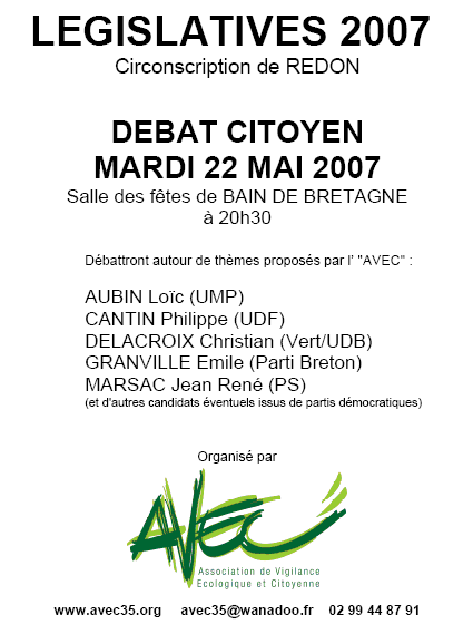L\'AVEC (Association de Vigilance Ecologique et Citoyenne) organise une grande soirée citoyenne le mardi 22 mai 2007 à la salle des fêtes de Bain de Bretagne à 20h30 dans le cadre de la campagne des législatives.