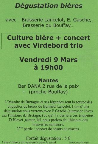 Avec Étienne Gasche (1), historien, Dominique Bloyet (2), journaliste écrivain-historien, Bernard Lancelot, fondateur en 1987 des bières du même nom à Saint-Vincent-sur-Oust, Yoran Delacour, fondateur des éditions Yoran Embanner à Fouesnant, et avec la Brasserie du Bouffay de Carquefou près de Nantes, Fulup Bonnet animera une soirée « Culture Bière » au bar Dana, 2 rue de la Paix à Nantes (quartier Bouffay), à partir de 19 h. La soirée sera animée musicalement à partir de 21 heures, avec des chants de marins par le trio "Virdebord" (3) qui nous interprétera les chansons de son tout récent premier disque Marins de douche.