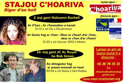 Pour la seconde année la Fédération C'hoariva propose, une série de trois stages de théâtre. Les stagiaires travailleront le chant et leur façon de parler breton sur une scène de théâtre.