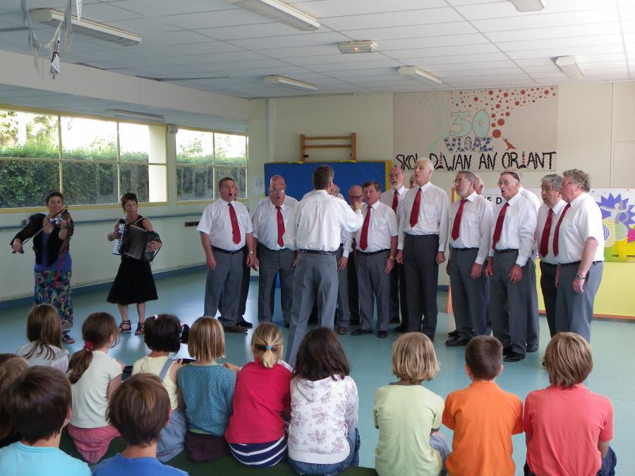 Accueillis par les élèves de CE et de CM, par la directrice Valérie Le Gall,Joël Legrand et Jean-Charles Le Corre, les Gallois ont pu écouter deux chants en breton interprétés par les enfants. La présentation des chants a été faite en gallois par Alan Hervé, président de Kanerion an Oriant. Côr Meibion Blaenporth a ensuite présenté plusieurs chants en gallois avant de terminer par l\'hymne commun au Pays de Galles et à la Bretagne.