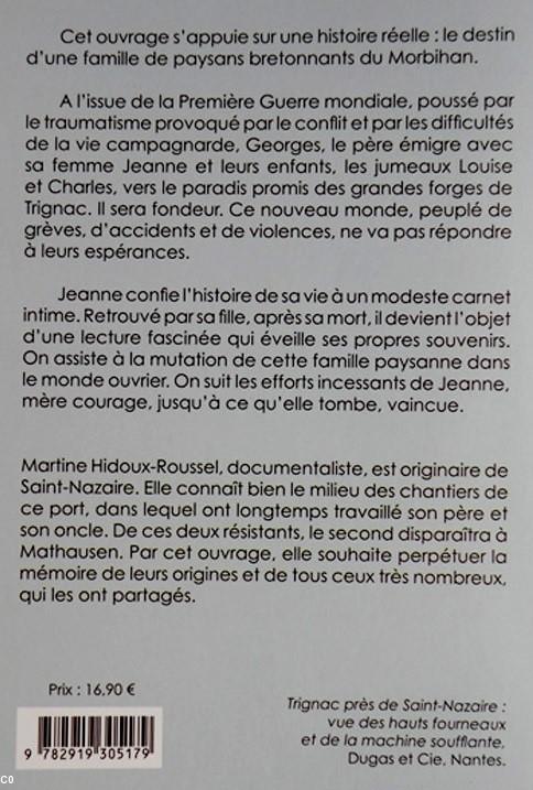 Martine Hidoux-Roussel, professeure documentaliste, née à Pornichet, dans une vieille famille du Morbihan bretonnant, connaît bien le monde du port, des chantiers et des forges de Trignac. Elle y a précédemment consacré un ouvrage couvrant la période d'avant-guerre : "La terre et les forges" (1). Elle continue dans celui-ci à perpétuer la mémoire du petit peuple, qui, après quatre ans de souffrances, redresse la tête et... retrousse ses manches. Elle a aussi publié "Conteurs et conteuses des montagnes bretonnes" (2) en 2007.Librairie Gweladenn Base sous-marine Bd de la Légion d'Honneur 44600 Saint-Nazaire tél : 02 40 22 16 10 Membre du réseau des librairies indépendantes bretonnes Kenstroll.