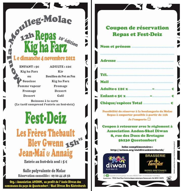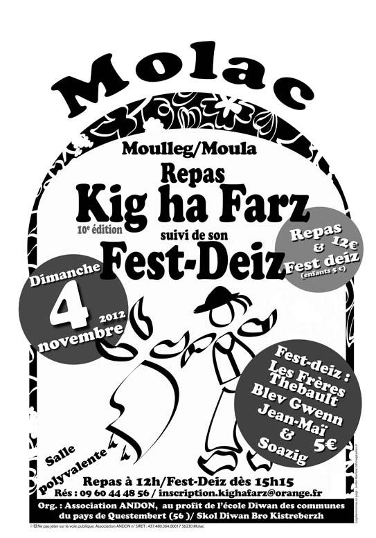 Pour la dixième édition, Andon-association culturelle du pays de Questembert, organise un repas - "Kig ha farz" animé le dimanche 4 novembre, à partir de 12h suivi d'un fest-deiz à 15h15, à la salle polyvalente de Molac, et ceci en soutien à l'école Diwan du pays de Questembert/Kistreberzh. Le kig ha farz est un plat traditionnel du Léon (nord Finistère), un Pot-au-feu breton, à base de farine de blé noir cuite dans un bouillon, avec trois types de viandes, accompagné de choux et autres légumes. Le fest-deiz sera animé par les groupes Blev Gwenn, Les frères Thébault, les chanteurs Jean Maï et Annaïg. Repas enfant moins de 12 ans : 5 euros (boissons à la carte): Kig ha farz ou saucisse-pommes vapeur, fromage, dessert Repas Adultes: 12 euros (comprend aussi le fest-deiz): kir, bouillon de pot-au-feu, kig ha farz, fromage, dessert, café, (boissons à la carte).