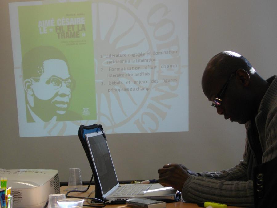 Du point de vue des marges : Aimé Césaire, discours postcolonial, pensée postmoderne ? c'est la contribution de Buata Malela, à Rennes ce vendredi 8 avril 2011. Cette conférence avait lieu à la Maison des sciences de l'homme en Bretagne, programmée par le groupe ERMINE (Équipe de Recherche sur les Minorités Nationales et les Ethnicités) dirigé par Ronan Le Coadic.Professeur adjoint à l'université Nicolas Copernic en Pologne, Buata Malela a soutenu sa thèse à l'Université Libre de Bruxelles (ULB) en Belgique. Il plaisante : « Jamais je n'aurais pu faire ce travail dans certaines institutions en France de façon aussi libre ». Il ajoute : « En ce moment, Césaire est très à la mode. Excusez-moi de n'avoir pas eu le temps d'analyser le discours de Nicolas Sarkozy au Panthéon : la seule chose que je peux vous dire, c'est qu'il n'a rien compris à Aimé Césaire et que son discours est surtout nourri par la vulgate sur Césaire ». No comment. Buata Malela a par ailleurs travaillé sur les littératures afro-antillaises et leurs relations avec la musique et la philosophie. Il remercie d'abord les chercheurs présents : « C'est l'une des rares fois où je parle en France à un public d'universitaires. J'ai surtout été invité par des associations diverses, mais rarement par les universités … »