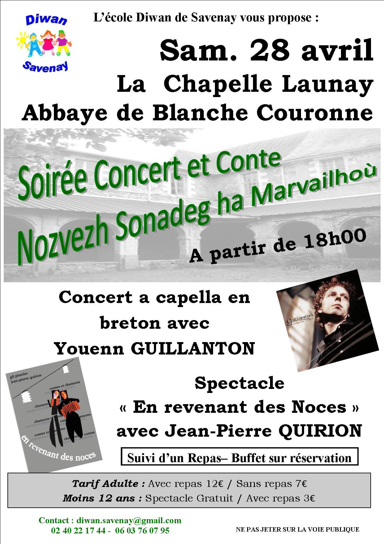 L'école Diwan de Savenay organise une soirée à l'Abbaye de Blanche Couronne à la Chapelle Launay. Concert a cappella en breton avec Youenn Guillanton et spectacle de conte avec Jean-Pierre Quirion accompagné en musique