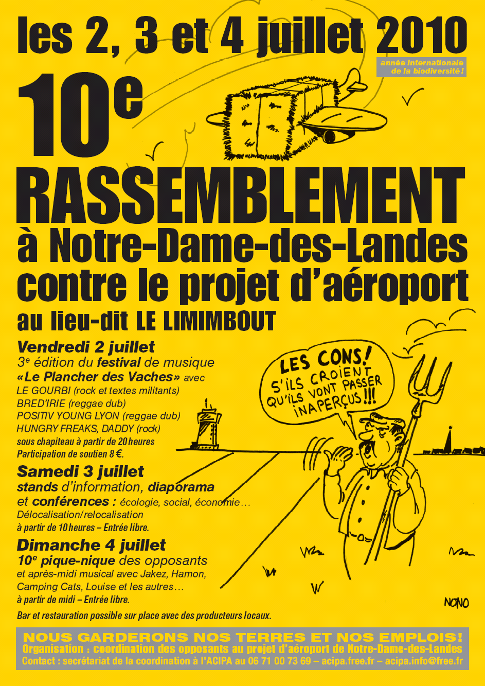 Communiqué de la coordination des associations et mouvements opposés au projet d'aéroport de Notre-Dame-des-Landes." Les opposants au projet d'aéroport de Notre-Dame-des-Landes organisent les 2, 3 et 4 juillet prochains leur 10e rassemblement estival au lieu-dit Le Limimbout à Notre-Dame-des-Landes. Ce rassemblement se déroulera sur 3 jours avec un programme varié (voir ci-dessous) et à destination de plusieurs types de public.