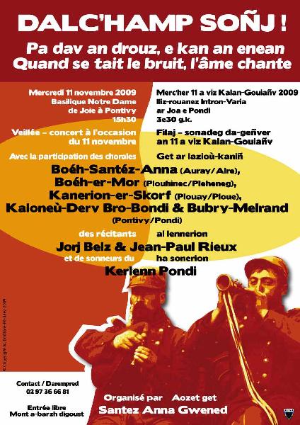 Ar gevredigezh Santez Anna Gwened a ginnigo ur lid hag ur sonadeg a-benn ar Merc'her 11 a viz Kala-Goañv 2009, da 3 eur 30 d'enderv, en Iliz-rouanez Intron-Varia ar Joa e Pondi .