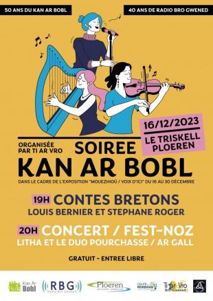 Soirée organisée dans le cadre de l’exposition “Mouezhioù / Voix d’ici”, créée à l’occasion des 40 ans de Radio Bro Gwened et 50 ans du Kan ar Bobl. Au programme : Contes, Concert et Fest-Noz. Evènement organisé par TI AR VRO Gwened, en partenariat avec la ville de Ploeren, l'espace Culturel Le Triskell, Radio Bro Gwened, le Kan ar Bobl et Tal er Mor. Avec le soutien de Golfe du Morbihan - Vannes Agglomération.
