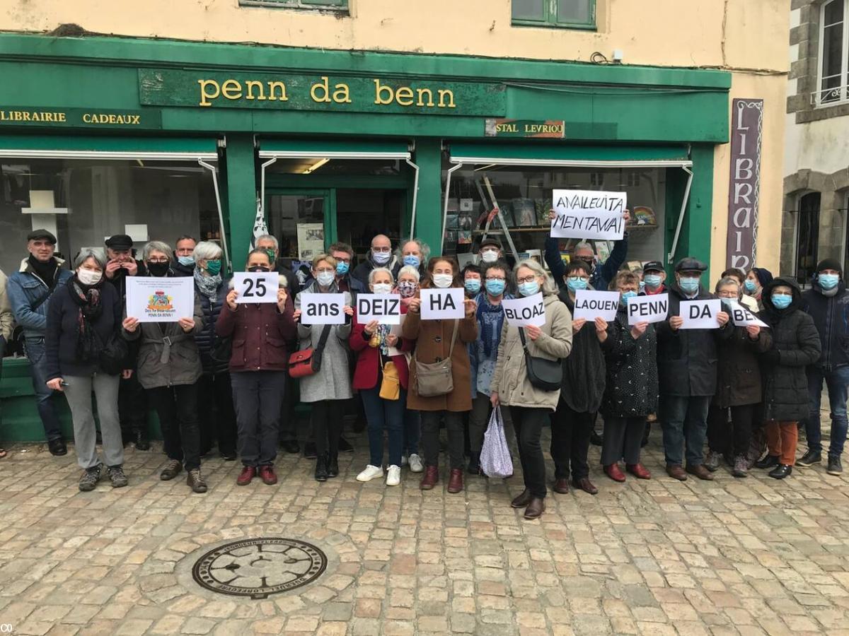 Marijo on est tous bien contents de fêter cet anniversaire parce ce que tu es complètement à l'ouest, d'avoir osé prendre la barre de ce bateau, contre vents et marées, contre tempêtes, coronavirus, désertification du centre ville... Car le vrai centre culturel de Quimperlé n'est pas route de Pont Aven, il est ici, avec ces centaines d'artistes, de chanteurs, de musiciens venus signer, jouer de la musique, chanter, conter, donner des cours de breton, déguster du muscadet... Grâce à toi, à Manu, à Mademos, à toute une équipe de potes, Penn da benn c'est le QG de l'amap, de mademos, de ti ar vro, des Jardins solidaires de Kerbellec, de Cent pour un toit, on y laisse un mot, on vient chercher un livre, un pot de miel, on y rencontre d'autres potes, on bâtit des projets... Grosses bises et tiens longtemps encore En plein centre de Qimperlé fais encore résonner binious et harpes, bardes et poètes, femmes et hommes qui se battent pour que ce pays ait un nom, une langue et un avenir..