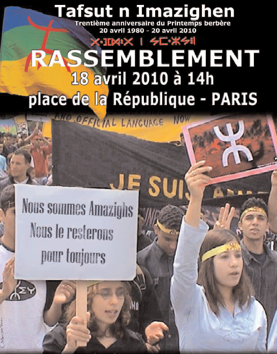 C'est donc tout naturellement que Kevre Breizh soutient ce 30e anniversaire du Printemps berbère et s'associe volontiers au collectif "Tafsut 2010" pour appeler au rassemblement unitaire qui aura lieu samedi 18 avril à 14 heures place de la République à Paris.