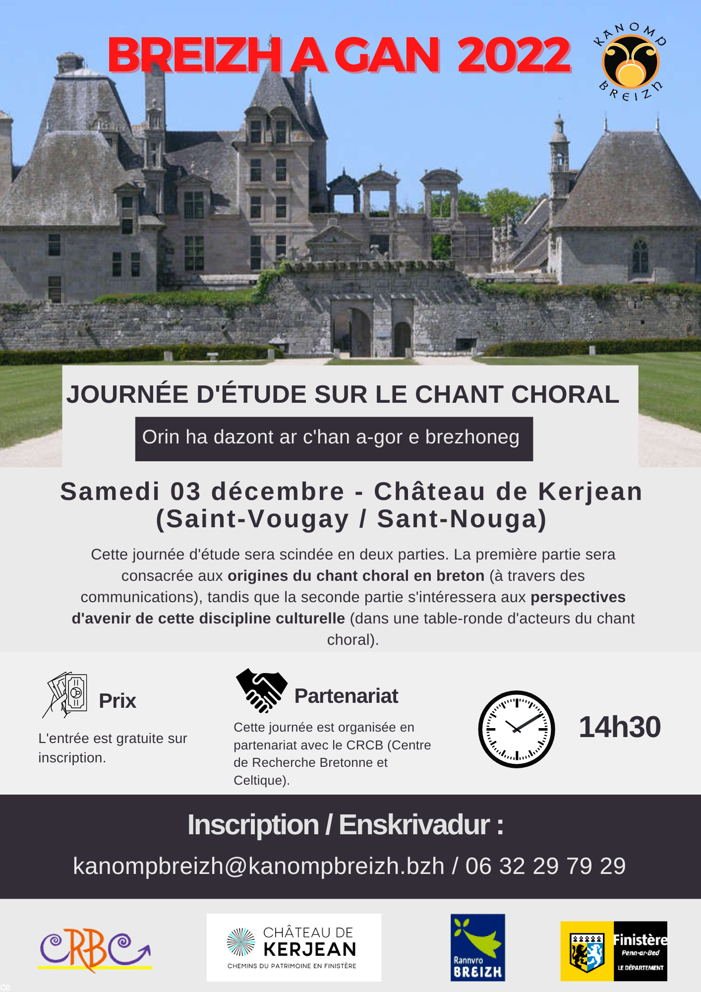 Le samedi 3 décembre 2022 aura lieu une journée d’étude sur le chant choral en breton au Château de Kerjean, en partenariat avec le CRBC (Centre de Recherche Bretonne et Celtique). Cette journée d’étude sera scindée en deux parties. La première partie sera consacrée aux origines du chant choral en breton (à travers des communications), tandis que la seconde partie s’intéressera aux perspectives d’avenir de cette discipline culturelle (dans une table-ronde d’acteurs du chant choral). 1ère partie : Communications – Yves Coativy (Directeur du CRBC) : Ouverture de la journée d’étude – René Abjean (Président d’honneur de Kanomp Breizh) : “Musique bretonne et chant choral” – Jean-Pierre Thomin (Président de Kanomp Breizh, chercheur associé au CRBC) : “Le Bleun Brug et l’émergence des chorales bretonnantes” ; “Le Pays de Galles, source majeure du chant choral en breton” – Yves Defrance (Ethnomusicologue) : “Les polyphonies vocales traditionnelles des pays d’Europe” – Jean-Yves Le Coz (Président de Mouezh Paotred Breizh) : “Les problématiques du chant choral en breton”