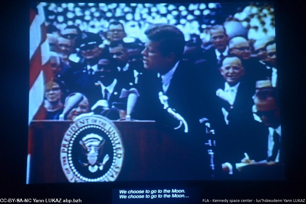 . Distroomp da vare ar Prezidant « Kennedy » (un añv iwerzhonat, a zo tost outañ ar brezhoneg « Quenerc’hdu/ Kenerc’h Du », keta ?). « we choose to go to the Moon. / Choajet hon eus mont betek al Loar, n’eo ket dre ma’z eo aes mes rak ez eo diaes! »A-raok fin an dekvloaziad. A-raok en doa goulennet digant Werner von Braun pevare e vefe posubl tizhout Al Loar (ha distreiñ, anat deoc’h). Respontet e noa von Braun: 1968! Ne oak et Kennedy ur penn foll. Prederiet en doa, douetañs en deus bet, ha divizout ha goulenn digant an Amerikaned pediñ evit ar raktres-se….