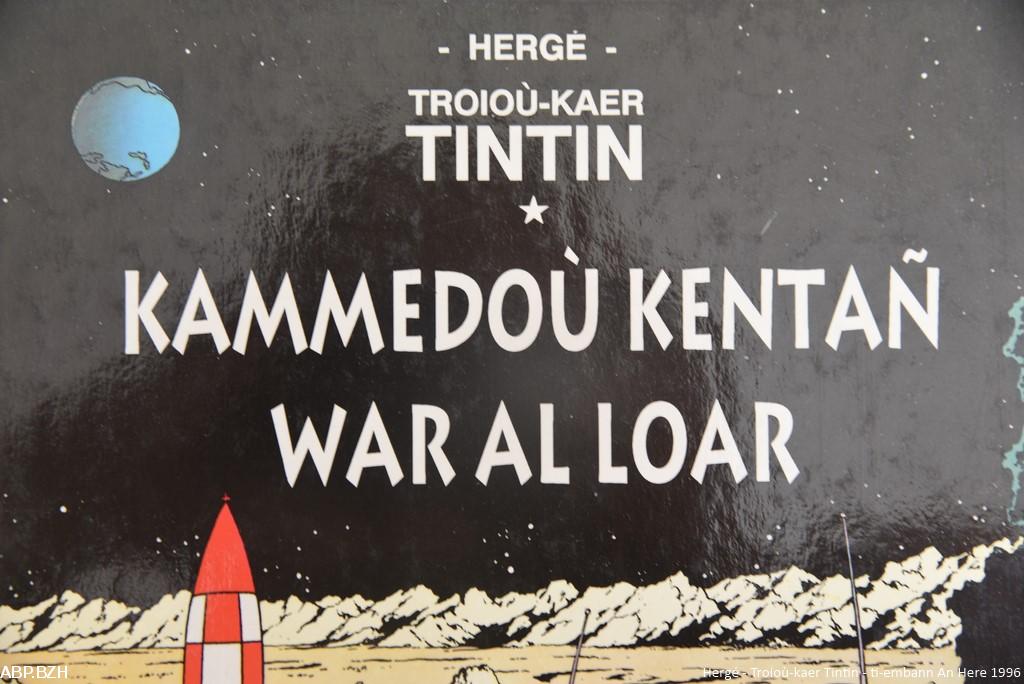 Tintin (1954, brezhoneg 1996): « Evit ar wezh kentañ moarvat en Istor Mab-Den EZ EUS UN DEN O KERZHET WAR AL LOAR! »