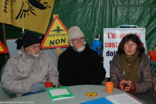 La grève de la faim de deux paysans contre le projet d'aéroport de Notre-Dame des Landes va entrer dans sa deuxième semaine. L'état de santé des grévistes est bon et ils sont plus déterminés que jamais à poursuivre leur action. Les très nombreux témoignages de soutien (passages, présences nocturnes, courriels...) les galvanisent et les renforcent. Ils sont rejoints depuis aujourd'hui 17 avril par Françoise Verchère, Conseillère générale de Loire-Atlantique, co-présidente du CéDpa (collectif d'élu-e-s). Françoise Verchère a précisé que devant le " silence assourdissant " des élus porteurs du projet, et de l’État, alors même que l'étude du cabinet Ce-Delft a montré les grossières erreurs du dossier, elle voulait par ce geste demander que l'irréversible, c'est-à-dire l'expropriation et l'expulsion, n'interviennent pas tant que les recours juridiques n'ont pas tous été tranchés.