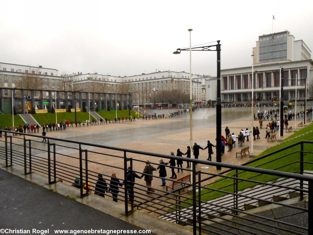Il était ensuite proposé à l'assistance de former une chaîne menée par une personne arborant un panneau indicateur qui disait en breton « Du breton dans la télé, du breton dans votre bouche » (brezhoneg 'barzh an tele / brezhoneg en ho peg). La chaîne humaine est partie de la rue Frédéric Le Guyader, derrière le Quartz, où se trouve France 3 Iroise, siège et lieu de production pour la Bretagne Ouest de France 3, puis descendit la rue de Siam jusqu'à la Rue Jean Macé, puis partit dans l'autre sens pour longer la Place la Liberté et passer devant l'Hôtel de Ville, avant de former une immense ronde qui suivait les limites de la grande esplanade pavée.