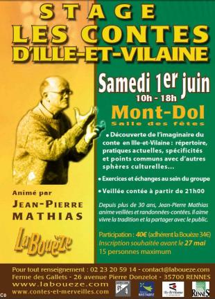 Samedi 1er juin, de 10h à 22h à la salle des fêtes de Mont-Dol,journée animée par le conteur professionnel Jean-Pierre Mathias. Ce stage d'apprentissage à l'art de conter est ouvert autant aux néophytes qu'à ceux qui ont une expérience personnelle. A partir de 21h, veillée pour tout public, à la lueur de torches, près de la chapelle sur le Tertre face à la baie du Mont-St-Michel (ou à la salle des fêtes en cas de pluie). 40¤ la journée (34¤ pour les adhérents de la Bouèze).